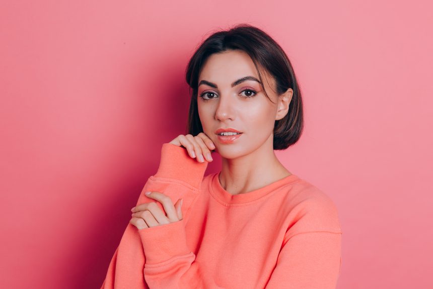 Portrait of beautiful smiling cute brunette woman model in casual peach sweater clothes with bright makeup and pink lips isolated